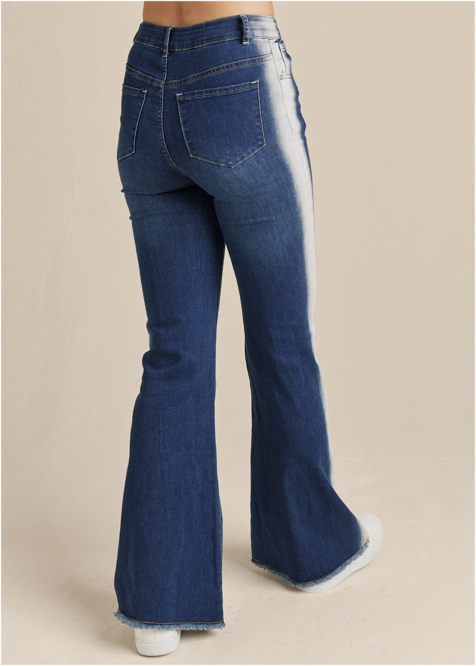 Vintage-inspired flare legs get an of-the-moment twist with the unique acid wash stripe from high waist to hem. Raw edges give this denim pair a casually-cool finish, upgrading a wardrobe classic, complete with 5-pocket styling, for wherever you're going.