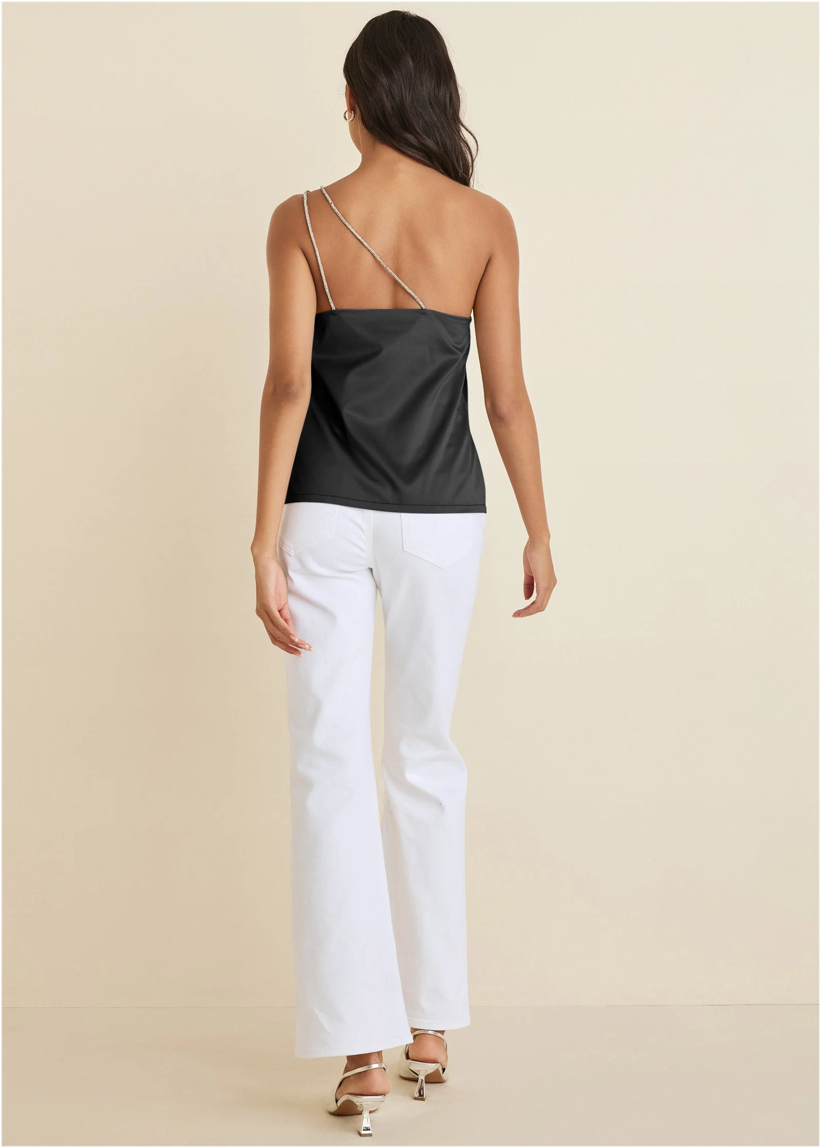 Get ready to shine all night long. The Shimmer One-Shoulder Top is your go-to party piece, featuring a sleek one-shoulder design and shimmering straps that catch the light with every move. This tank is the perfect blend of chic and sultryâideal for a night out, a special event, or any occasion where you want to make an entrance. Pair it with pants or a matching skirt for a show-stopping look thatâs guaranteed to turn heads.
