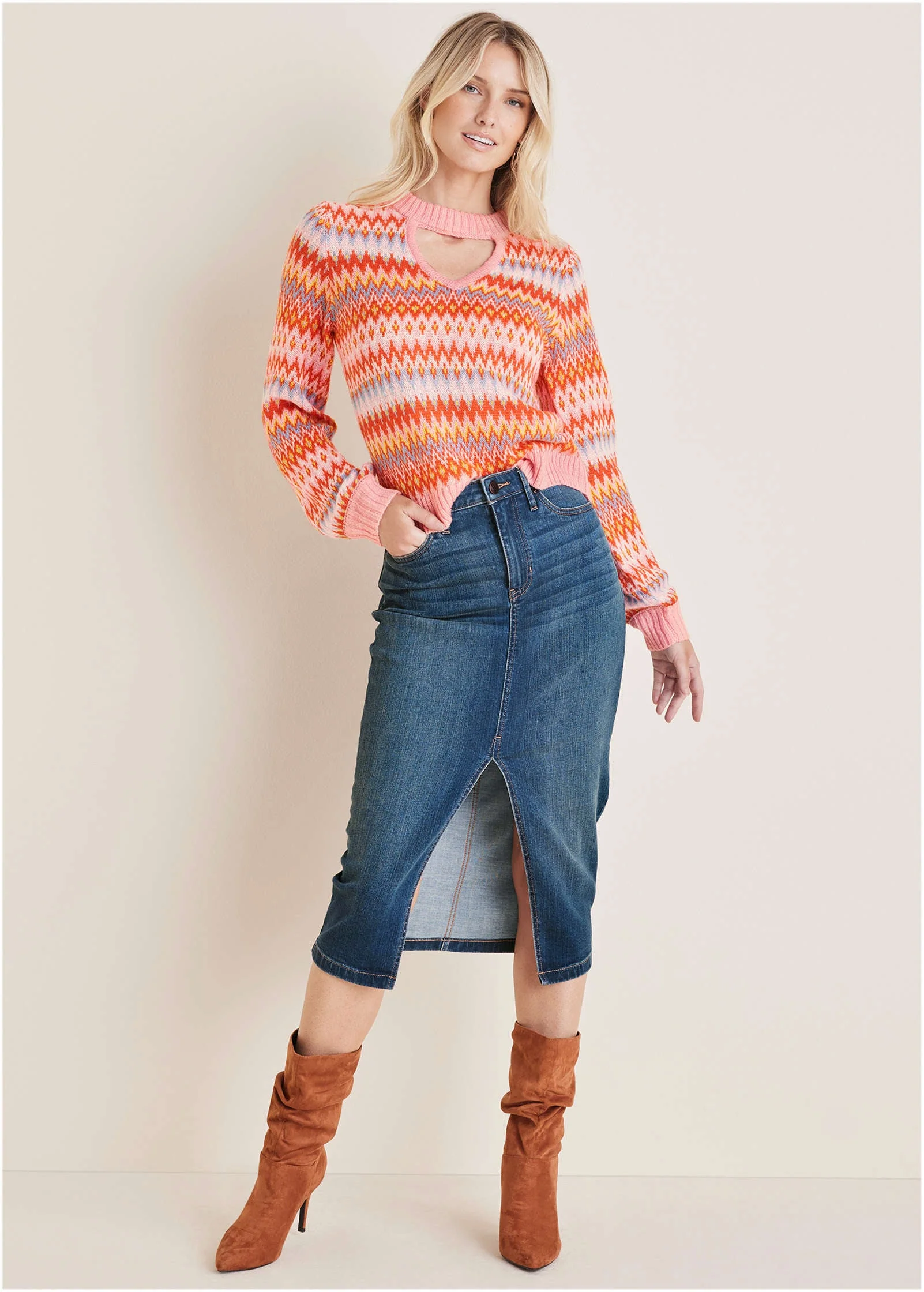 This colorful Fair Isle sweater is the antidote to gray winter days. Brightly-colored and ultra-soft, you'll feel cheerful the minute you slip it on. A keyhole detail sitting beneath the mock neckline adds just enough pizazz to keep things interesting. Rock this knit with a denim skirt and boots for a chic spin on cozy sweater dressing.