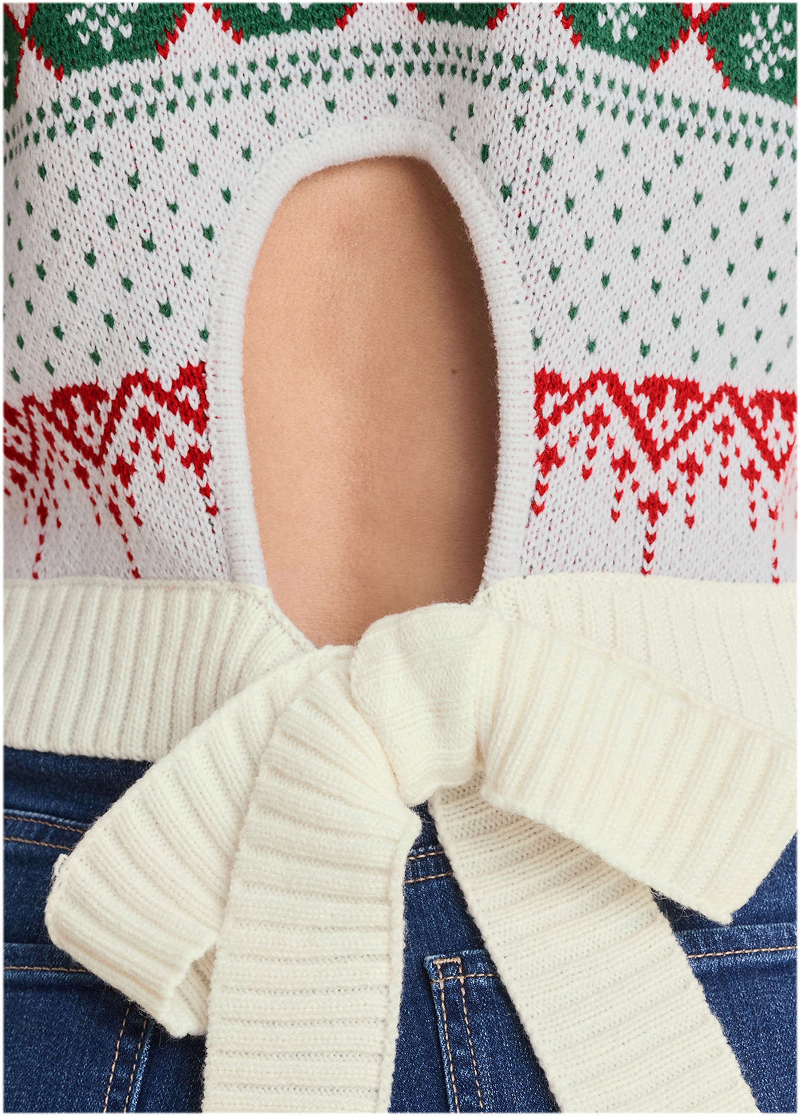 This holiday season, your presence is the real present, so why not dress like it? This festive Fair Isle knit will help you do exactly that since you'll be wrapped up like a gift and finished off with a bow. From the front this knit is all cozy, but in back it packs a serious punch with an unexpected cutout that adds some spice. With your fave jeans and bold heels, this sweater is ready for a casual holiday soiree.