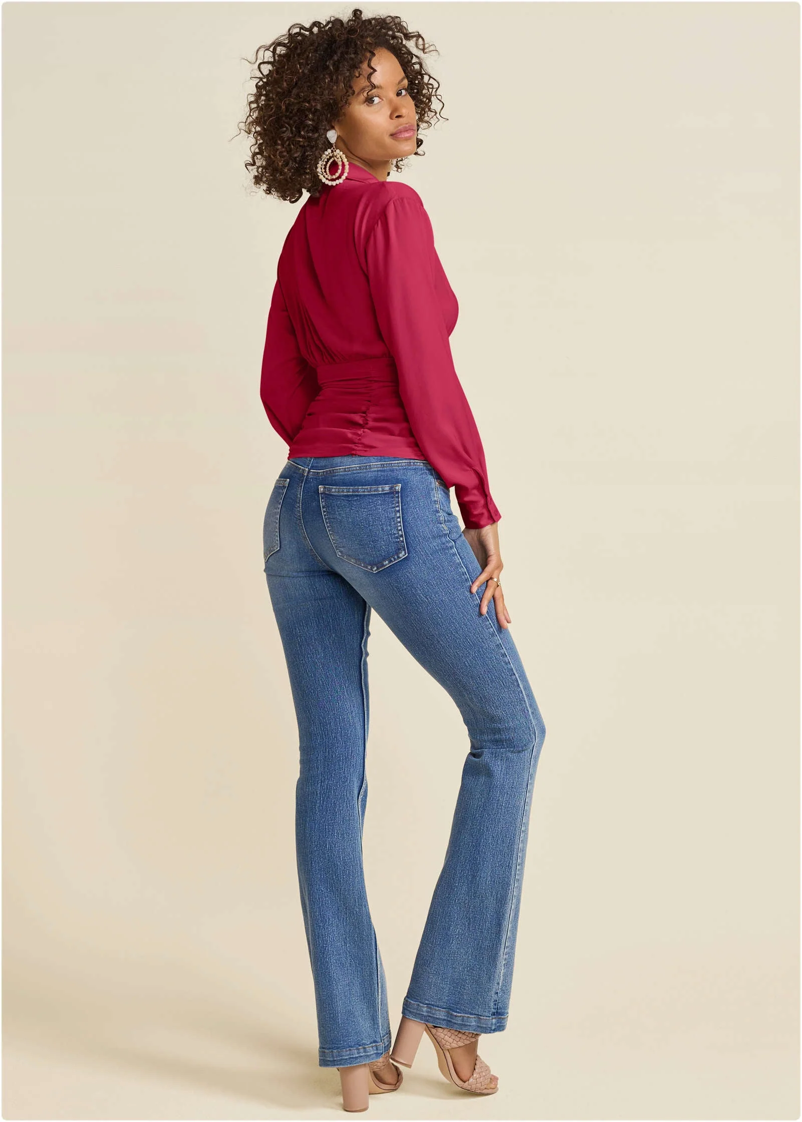 Meet your new go-to blouseâpolished, flattering, and ready for anything. The structured collared neckline keeps it sleek, while the ruched waist hugs your curves in all the right places. With long sleeves for a touch of sophistication, this top effortlessly transitions from office hours to after-hours. Pair it with tailored pants and a blazer for work or switch to denim and heels for a date-night glow-up.